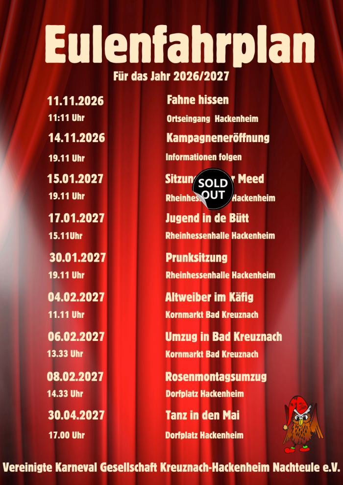 Wer also die nächsten Jahre mit den „VKGKH Nachteule e.V.“ so richtig Fassenacht feiern möchte, sollte sich die nachfolgenden Termine vorsorglich notieren oder diese Seite an die Pinnwand hängen.